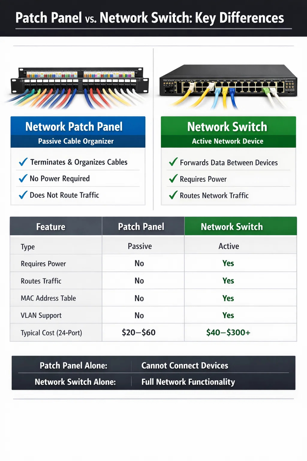 A mrežni patch panel je organizacijski alat za strukturno kabliranje. Potpuno je pasivan, ne zahtijeva napajanje i samostalno ne pruža mrežnu funkcionalnost. Mrežni prekidač je aktivni mozak vaše žične mreže — bez njega ništa ne komunicira. Potreban vam je prekidač bez obzira na to koristite li patch panel.