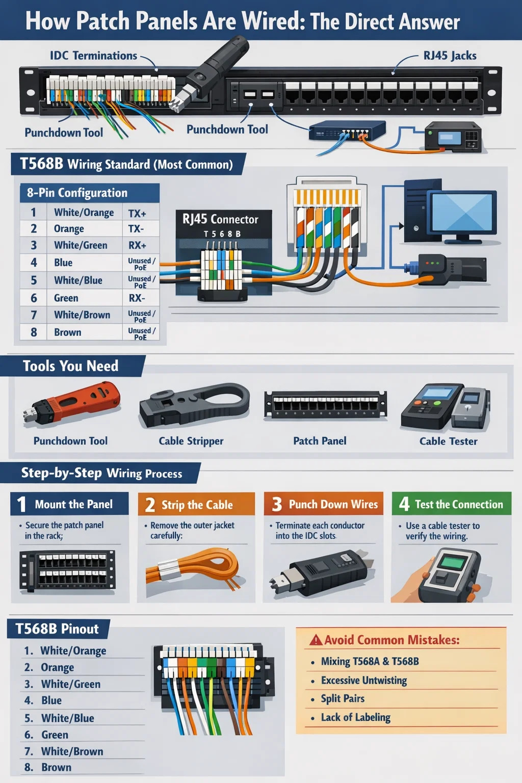 A mrežni patch panel ožičen je završavanjem pojedinačnih bakrenih vodiča iz strukturiranog kabliranja na stražnjoj strani ploče pomoću alata za bušenje prema dolje, prema stiardu ožičenja T568A ili T568B. Svaki od osam vodiča u kabelu Cat5e, Mačka6 ili Cat6A postavljen je u utor IDC (Insulation Displacement Connector) označen bojom na stražnjoj strani priključka patch panela. Nakon što se probije, prednji dio ploče izlaže RJ45 keystone utičnice, omogućujući kratkim kabelima za spajanje opreme na prekidače, usmjerivače ili druge mrežne uređaje.
