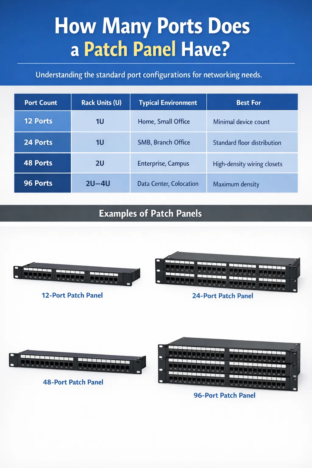 Broj priključaka nije proizvoljan — on izravno određuje koliko mrežnih uređaja možete prekinuti i upravljati s jedne ploče. Odabir pogrešnog broja priključaka dovodi ili do potrošene nekretnine u stalku ili do kaotičnog širenja kabela koji s vremenom postaje noćna mora za održavanje. Razumijevanje dostupnih konfiguracija prvi je korak prema čistoj, skalabilnoj mrežnoj infrastrukturi.