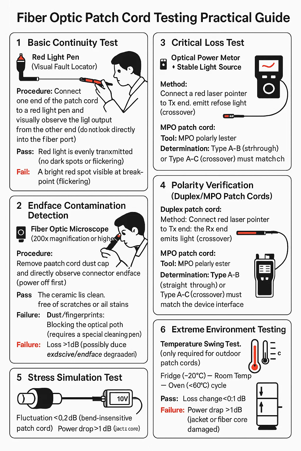 Proći: Fluctuation ≤0.2dB (bend-insensitive patch cord). Failure: Power drop > 1dB (jacket or fiber core damaged).