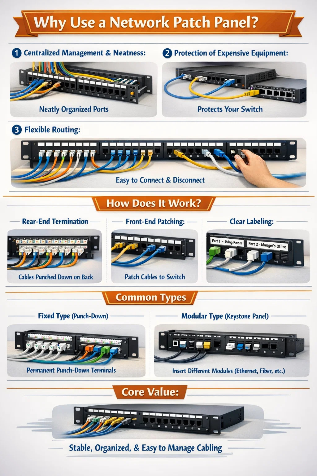 Zamislite da imate mrežne kabele iz 20 soba izravno spojene na prekidač; ako se kablovi zapetljaju, bio bi nered. S mrežnom patch pločom, svi dugački kabeli koji izlaze iz zidova uredno su pričvršćeni na stražnjoj strani ploče, dok prednja strana ima niz uredno raspoređenih priključaka.