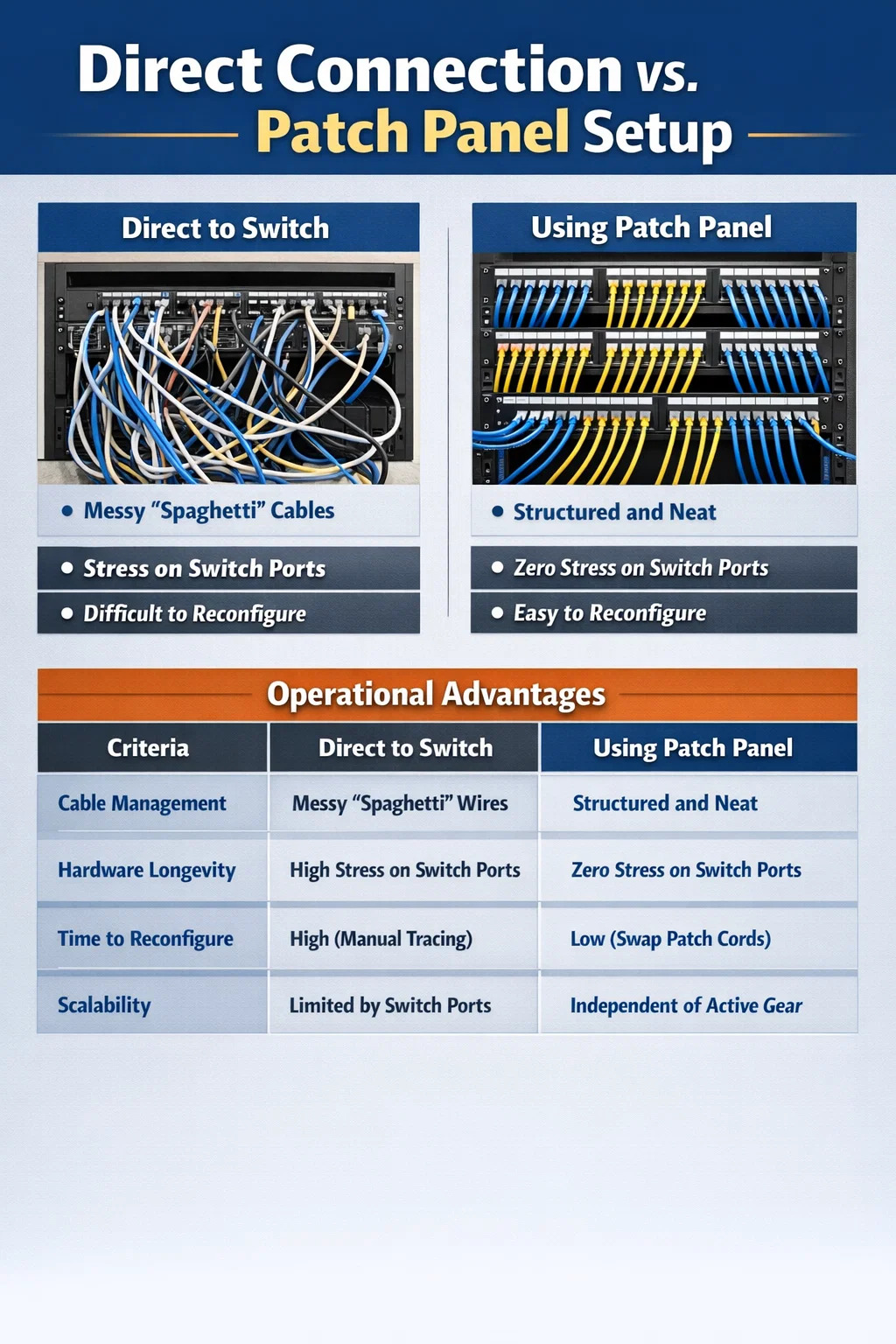 Kada jedna soba izgubi internetsku vezu, pronaći pravu žicu u snopu od 24 ili 48 identičnih plavih kabela prava je noćna mora. Patch panel unosi red u ovaj kaos kroz standardizirano označavanje i logičko grupiranje.